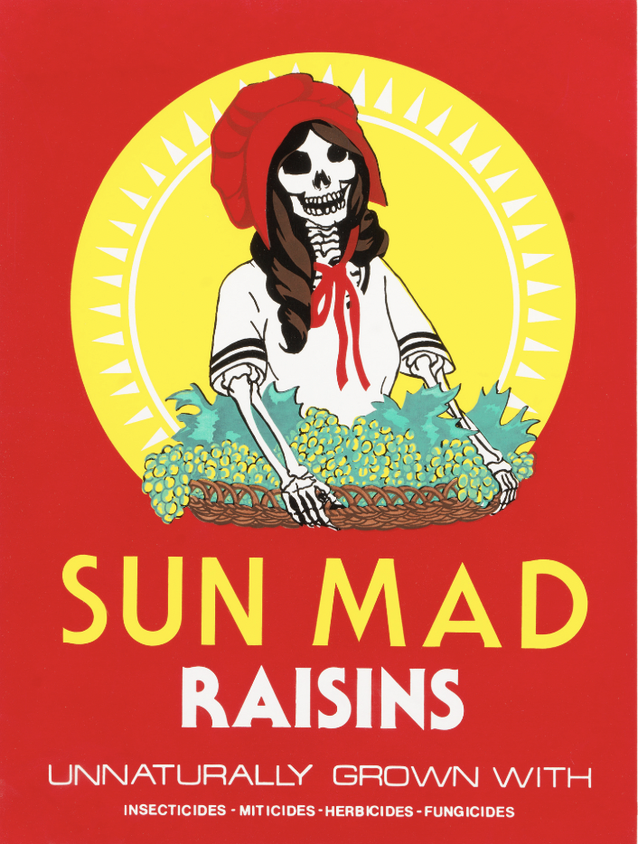 Una serigrafía de Ester Hernandez Sun Mad es una respuesta al exposición de pesticidas y polución su familia sobrevivía en California. Las empresas causan contaminación con sus prácticas sin cuidar para el público. Las familias inocente tiene que vivir en condiciones de mala salud porque las empresas quieren ganar dinero. Una tema en el movimiento Chicano es discutir cómo hay sistemas en el mundo que necesitan cambiar. En este ejemplo, hay comentario como la comida en los Estados Unidos tiene productos químicas que duelen la gente. Hernandez querría exposer la industria de comida y los peligros que vienen con sus productos.