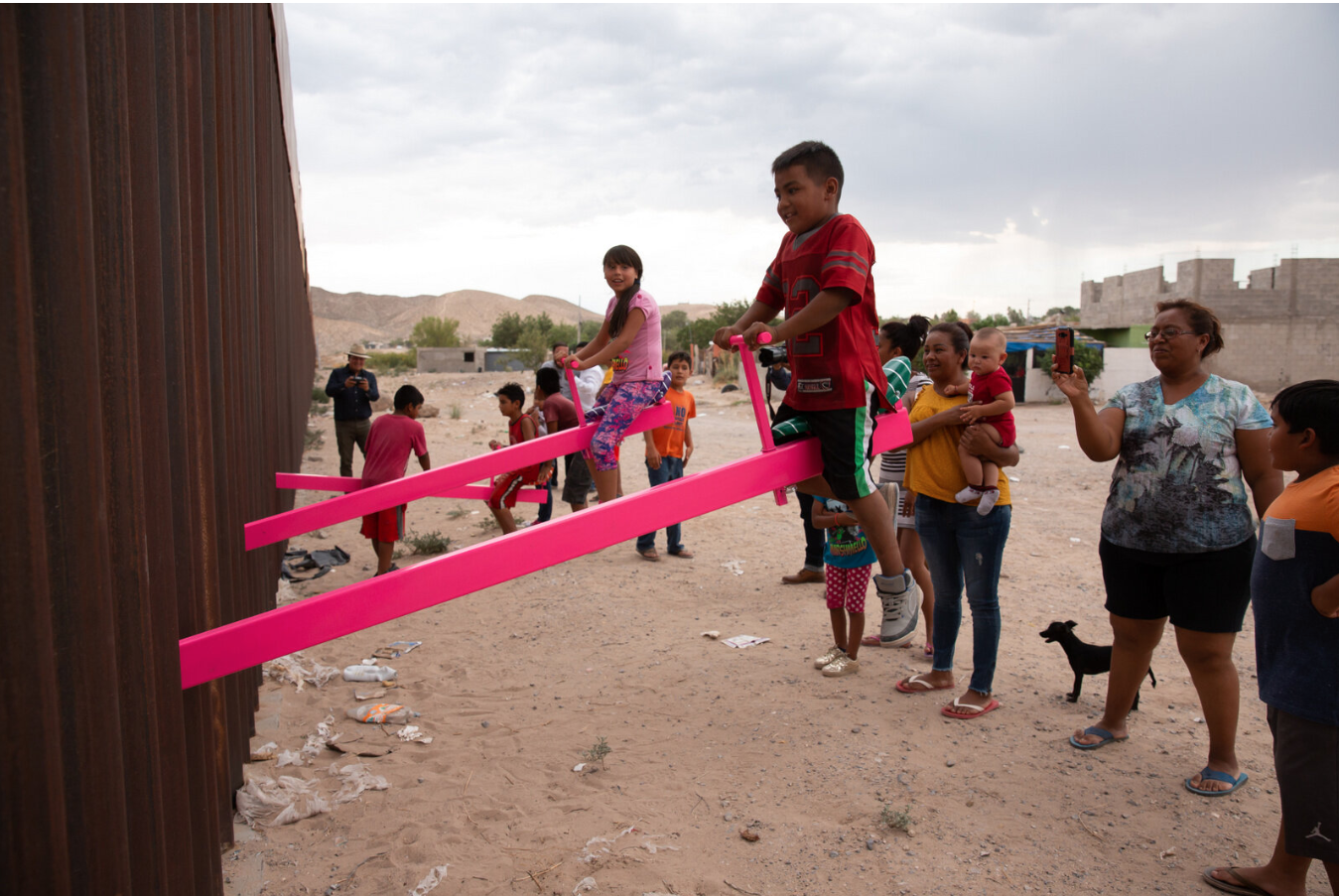 Por otro lado, los arquitectos Ronald Rael y Virginia San Fratello habían conceptualizado un proyecto en 2009 como parte de su trabajo en curso explorando la región fronteriza, pero no fue hasta 2019 que pudieron implementarlo, haciendo aún más significativa su realización. Titulada “Teeter-Totter-Wall”, esta poderosa instalación en el muro fronterizo entre Estados Unidos y México entre El Paso, Texas y Ciudad Juárez duró aproximadamente 40 minutos, pero las imágenes y videos de personas jugando en los balancines se volvieron virales a nivel mundial, lo que lo hizo viral y una de las declaraciones artísticas más impactantes sobre las relaciones fronterizas.