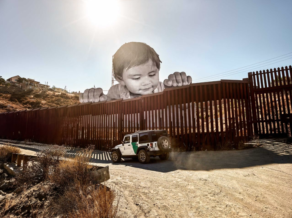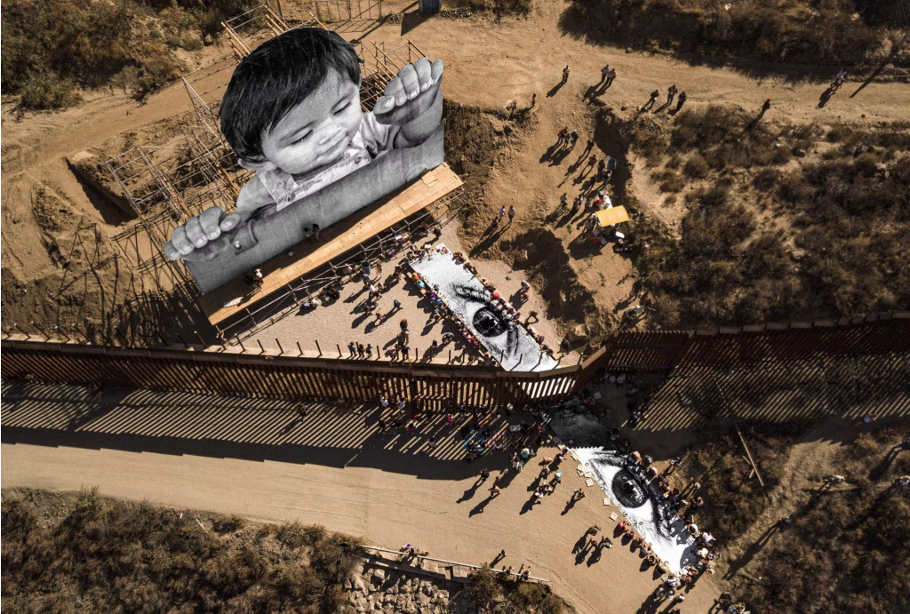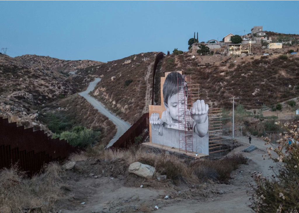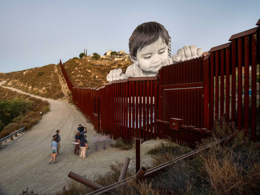 En 2017, el artista francés JR instaló una enorme fotografía en blanco y negro de un niño de un año llamado Kikito mirando por encima del muro fronterizo entre Estados Unidos y México en Tecate, México. Esta imagen que muestra al niño aparentemente agarrando la parte superior de la valla fronteriza y mirándola juguetonamente, permaneció en el lugar durante un mes y pudo verse desde ambos lados de la frontera. Con una altura de unos 70 pies, la instalación temporal fue diseñada para humanizar el debate sobre la inmigración al centrarse en la inocencia de los niños y desafiar las percepciones negativas sobre fronteras y barreras (Morrissey 2020). Kikito era en realidad un niño mexicano que vivía con su familia en una casa cerca del lugar de la instalación, y su imagen gigantesca se convirtió en un poderoso símbolo en el discurso actual sobre inmigración y política fronteriza.