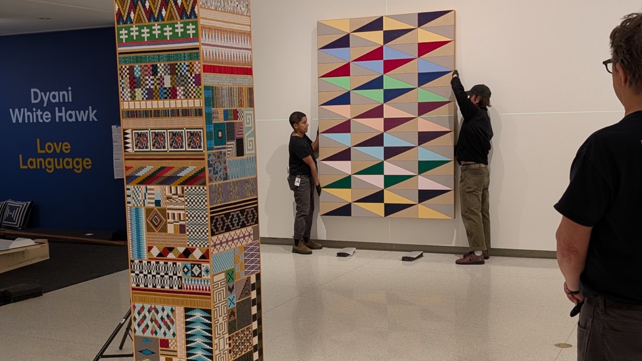Installing Wowačhi I Dancing at the Walker Arts Center, Minneapolis. (l-r) Curators Siri Engberg and Tarah Hogue (Métis)( via phone), artist Dyani White Hawk, RMA’s Austin Reeves, and Kayla Nordlund, Associate Registrar.