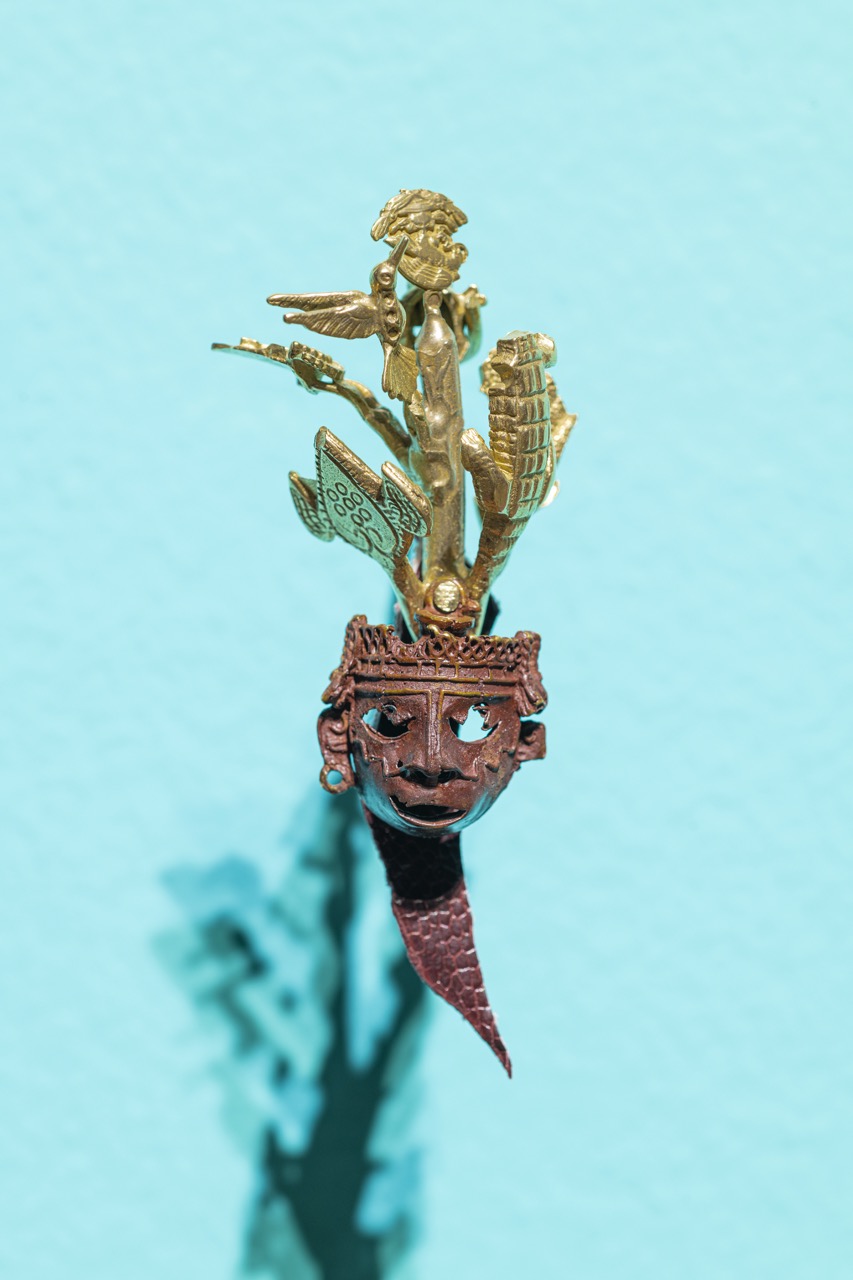 The piece displayed here examines the mask in its different forms—archaeological artifact, handcrafted replica, and artwork. Rooted in historical research and personal experience, Hernández Vargas’s work questions traditional stories of power, heritage, and culture, prompting viewers to think critically about how objects are collected, shown, and understood.